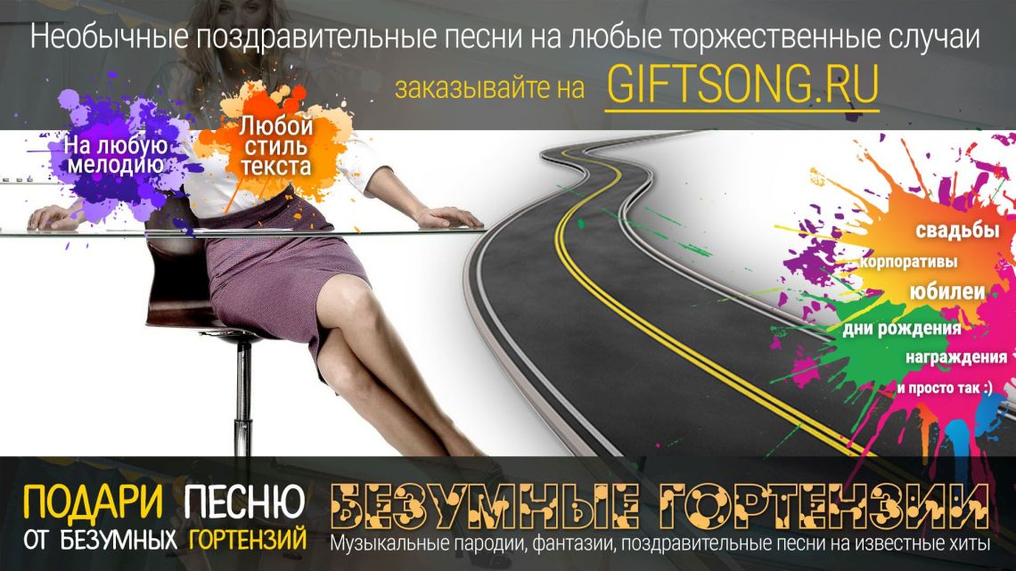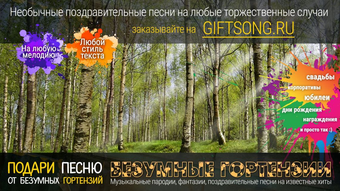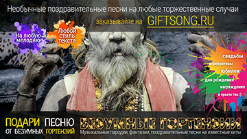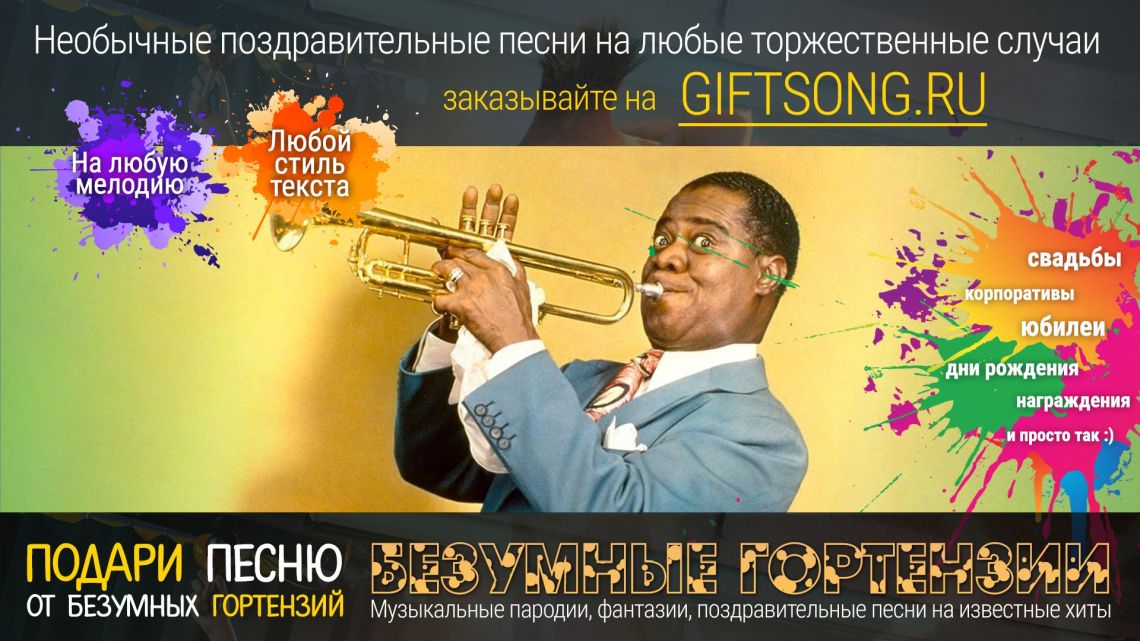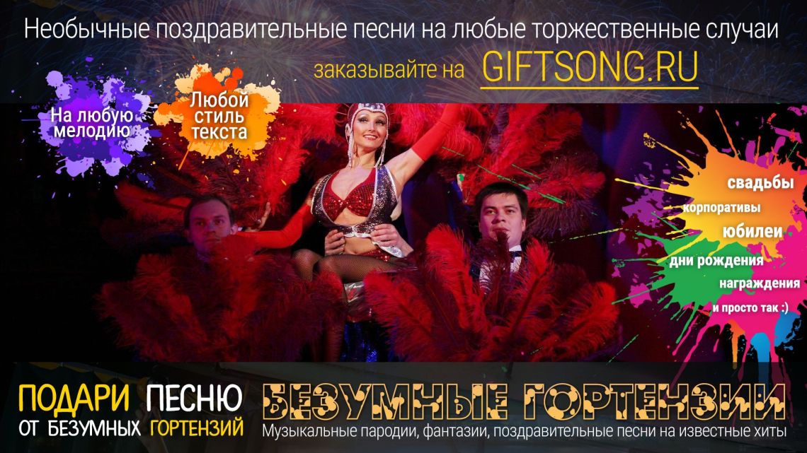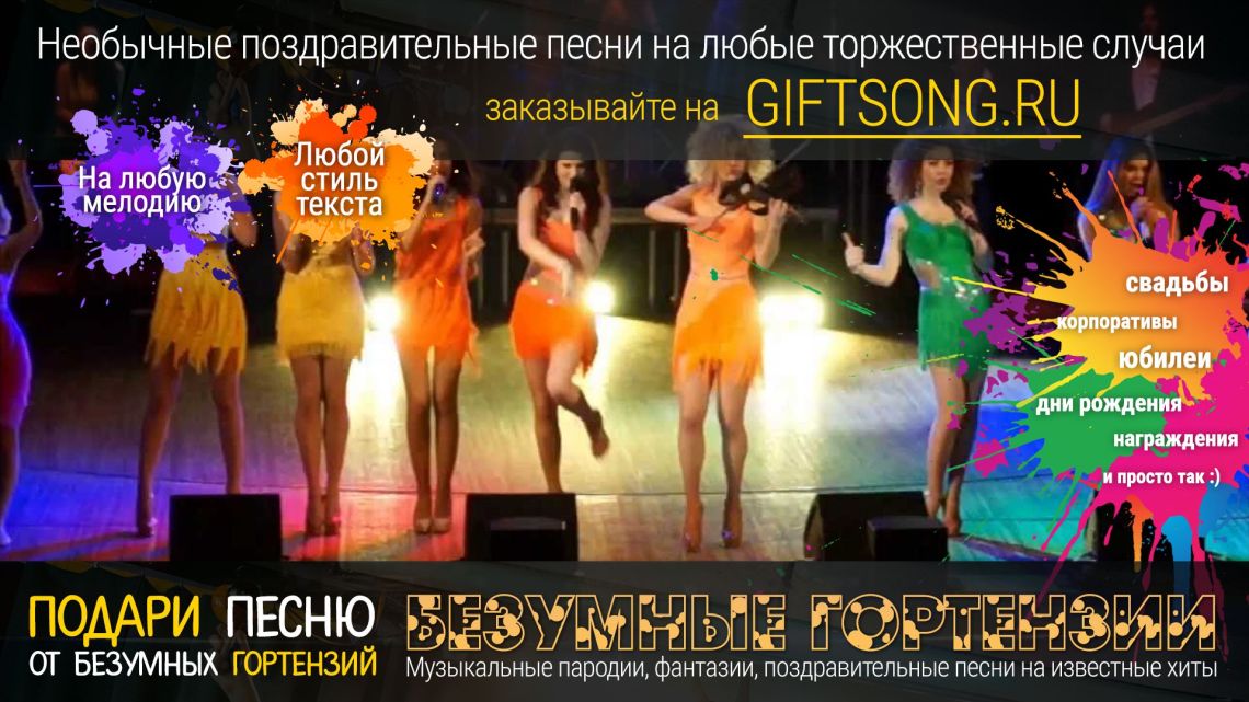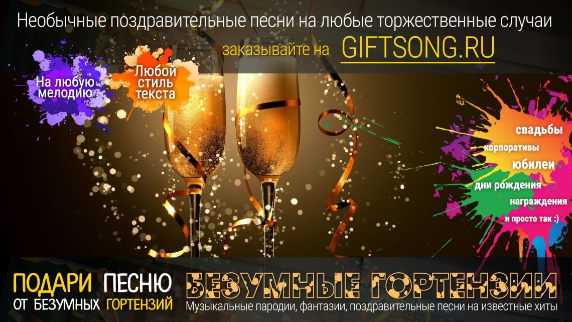 Песня в подарок — отличный вариант для самых смелых и оригинальных. Она расскажет о виновнике торжества, о вашем друге, родственнике или о целом коллективе! Мы придумаем и запишем для вас уникальную искрометную поздравительную песню, которая расскажет о виновнике торжества, порадует всех гостей и произведет фурор на торжественном мероприятии.