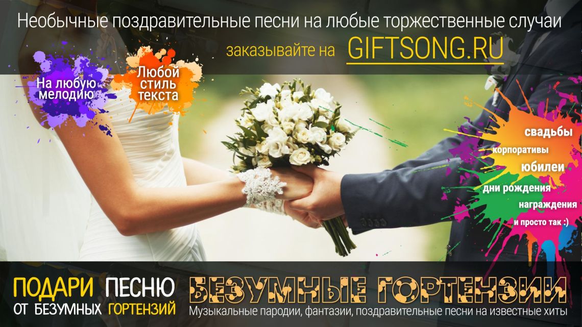 Если молодожены - выходцы из разных стран, то и у них есть шанс получить музыкальное поздравление от "Безумных Гортензий". Дело в том, что наша вокалистка YaniPooh прекрасно владеет английским языком и может не только спеть на нем, но и создать уникальный текст. Поздравляем наших "брачующихся" Энни (русскую девушку Аню) и Энди (англичанина Andrew) и желаем им счастья! Ничего не нужно, лишь бы любимые люди были всегда рядом!